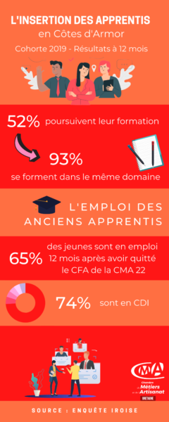 65% des jeunes interrogés sont entrés sur le marché du travail. Parmi ces anciens apprentis, 12 mois après avoir quitté le CFA de la CMA22 :