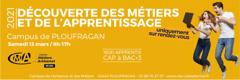 Tu es à la recherche d’une orientation ? Tu veux en savoir plus sur les métiers de l’artisanat ? Le Campus de Ploufragan organise des rendez-vous découverte des métiers de l’artisanat en apprentissage, le samedi 13 mars, de 9h à 17h. Afin de garantir la sécurité de toutes et tous, les rencontres sont organisées dans le respect des gestes barrières et se font sur rendez-vous uniquement.